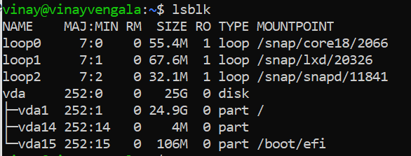 lsblk command reads the sysfs filesystem and displays the block device information on the Terminal window.