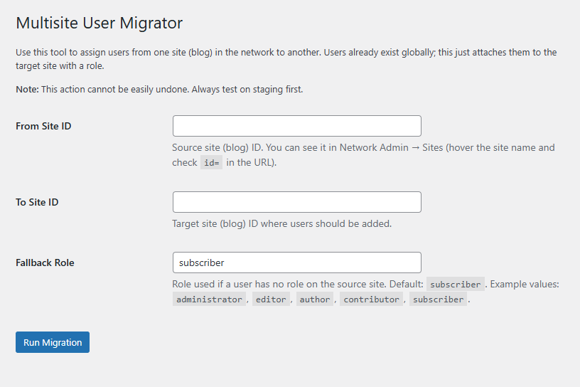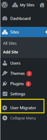 * Description: One-time (or repeated) user migration between sites in a WordPress Multisite network via Network Admin UI.
